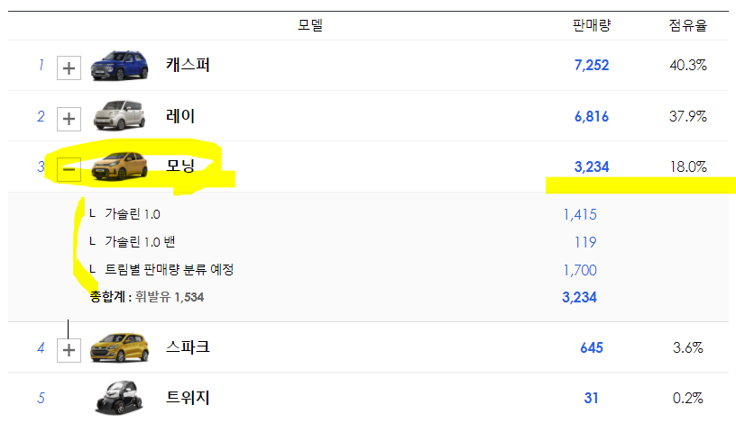 모닝은 배기량 998cc의 3기통 엔진을 사용해 최고출력 76마력, 최대토크 9.7kg.m입니다. 기아차 준중형 세단 K3가 배기량 1598cc에 최대출력 123마력, 최대토크 15.7kg.m인 것과 비교하면 5분의 3 정도에 이르는 힘을 가진 셈입니다. 연비는 14.7km~15.7km/L입니다.모닝 #차량가격 스탠다드 1195만 스탠다드 마이너스 1175만 프레스티지 1350만 시그니처 1480만 시그니처 엣지 UP1545만