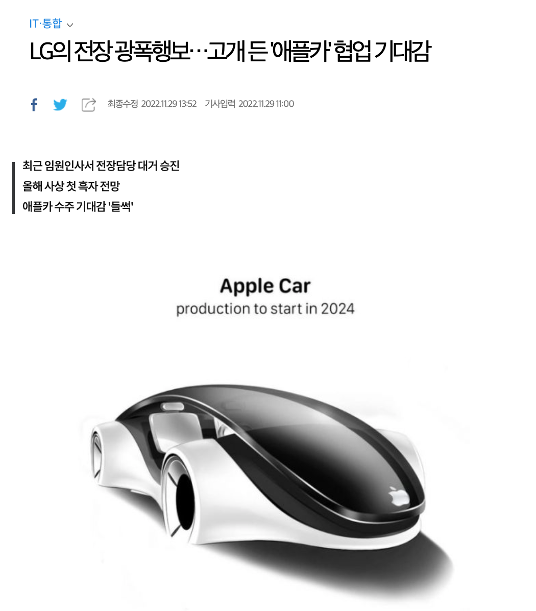 정말 LG전자가 이렇게 눈에 띄는 이유는 무엇일까요?일단 LG 마그나(*LG전자+마그나)가 애플과 협업을 한다는 소식은 없습니다.즉, 아직까지는 우리만의 김칫국물로 아무것도 정해진 것이 없습니다.다만 애플은 자동차 생산라인이 없어 직접 생산라인을 만들기보다는 위탁생산 가능성이 높기 때문입니다.미국 바로 위의 마그나가 캐나다에 있으니까요.