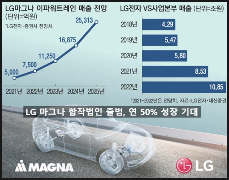 LG전자, 캐나다 마그나와 전기차 파워트레인 합작법인 설립 (종합) VS 사업부 내 녹색사업 물적분할 내년 7월 출범 예정 (서울=연합뉴스) 서미숙 기자 = LG전자가 세계 3위 자동차부품업체인 캐나다 마그나인터내셔널(이하 마그나)과 손잡고 전기차 파워트레인 분야 합작법인을 설립한 news.naver.com