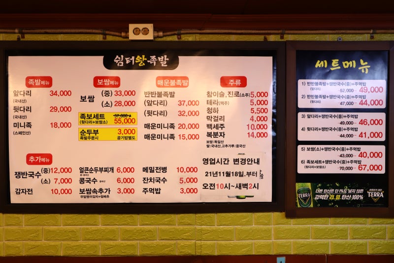 족발, 보쌈, 족보세트 등의 기본 구성과 함께 식사와 사이드 안주로도 좋은 추가 메뉴도 있었고 주류도 제격! 더불어 합리적인 가격에 더욱 맛있게 먹을 수 있는 세트 메뉴도 준비되어 있었다.이날은 친구와 짝꿍까지 3명이라 망설이지 않고 바로 세트메뉴로 골랐다.