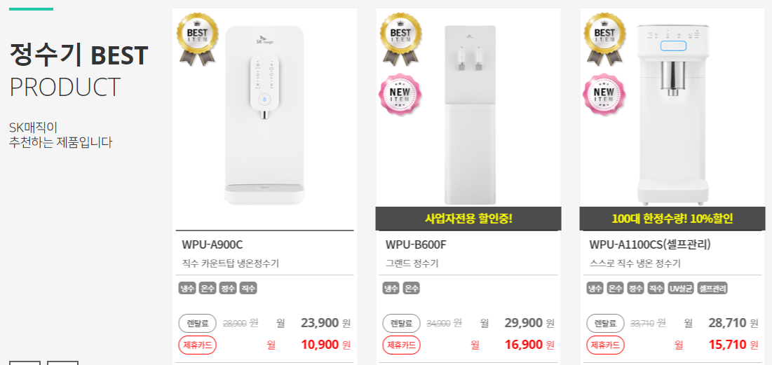 렌탈의 경우 제휴 카드를 사용하면 월 요금 할인이 되기 때문에 더 싸게 사용할 수 있다고 했습니다.정수기 렌탈 가격 비교를 여기저기 상의해보니 냉온정수기가 제품 종류도 다양하고 사은품 혜택이 좋더라구요.