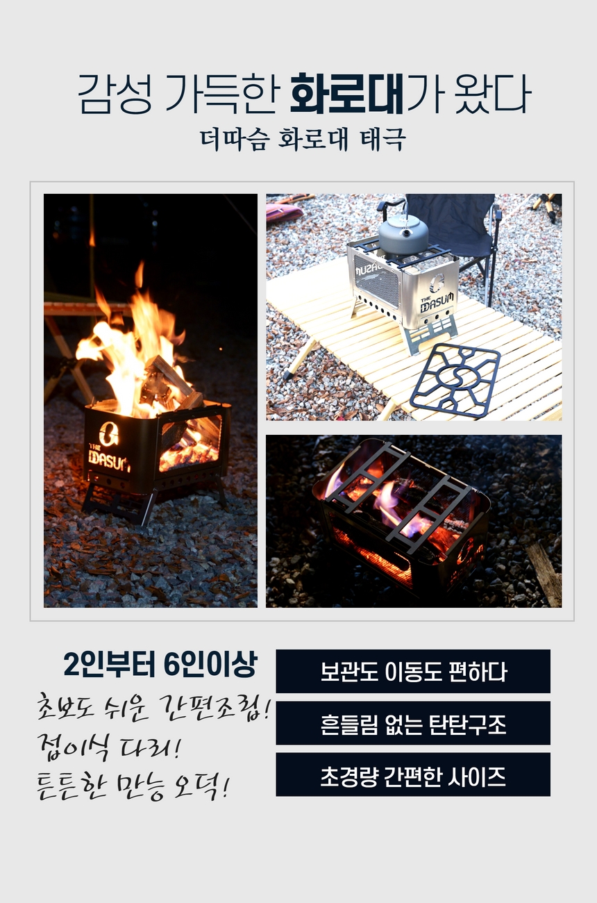 하부와 상단 메쉬망을 통해 공기순환이 잘 되고 장작이 잘 타며 깨끗한 색상의 불꽃놀이를 볼 수 있습니다.캠핑화 롤대 사용 시 갑판 위에서는 사용하지 마시고 바람이 강한 날에는 불씨가 날아가 텐트에 구멍이 날 수도 있으니 주의하시기 바랍니다. 또한 스테인리스제로 열기가 오래 지속되므로 맨손으로는 만지지 말고 완전히 식은 후 재를 버리고 먼지를 털어낸 후 수납봉투에 넣어 보관하시면 됩니다. 저도 처음에는 화대를 씻기도 했는데 녹만 생기고 어차피 쓰다 보면 더러워지니까 재만 잘 털어내고 쓰면 된다는 주의입니다.캠핑장 밤을 따뜻하고 로맨틱하게 만들어주는 화로대 리뷰는 어떠셨나요? 자세한 정보는 링크에서 확인하실 수 있습니다.캠핑장 밤을 따뜻하고 로맨틱하게 만들어주는 화로대 리뷰는 어떠셨나요? 자세한 정보는 링크에서 확인하실 수 있습니다.캠핑장 밤을 따뜻하고 로맨틱하게 만들어주는 화로대 리뷰는 어떠셨나요? 자세한 정보는 링크에서 확인하실 수 있습니다.두따숨 불몽 감성 캠핑 화로대 태극 : 두따숨 [두따숨] 국내 유일 전자파 없음 건식족욕기, 각탕기, 반신욕기, 편백나무족욕기, 온수매트, 온수침대, 건강애완동물용품 smartstore.naver.com두따숨 불몽 감성 캠핑 화로대 태극 : 두따숨 [두따숨] 국내 유일 전자파 없음 건식족욕기, 각탕기, 반신욕기, 편백나무족욕기, 온수매트, 온수침대, 건강애완동물용품 smartstore.naver.com#접이식화로대 #화로대 #캠핑화로대