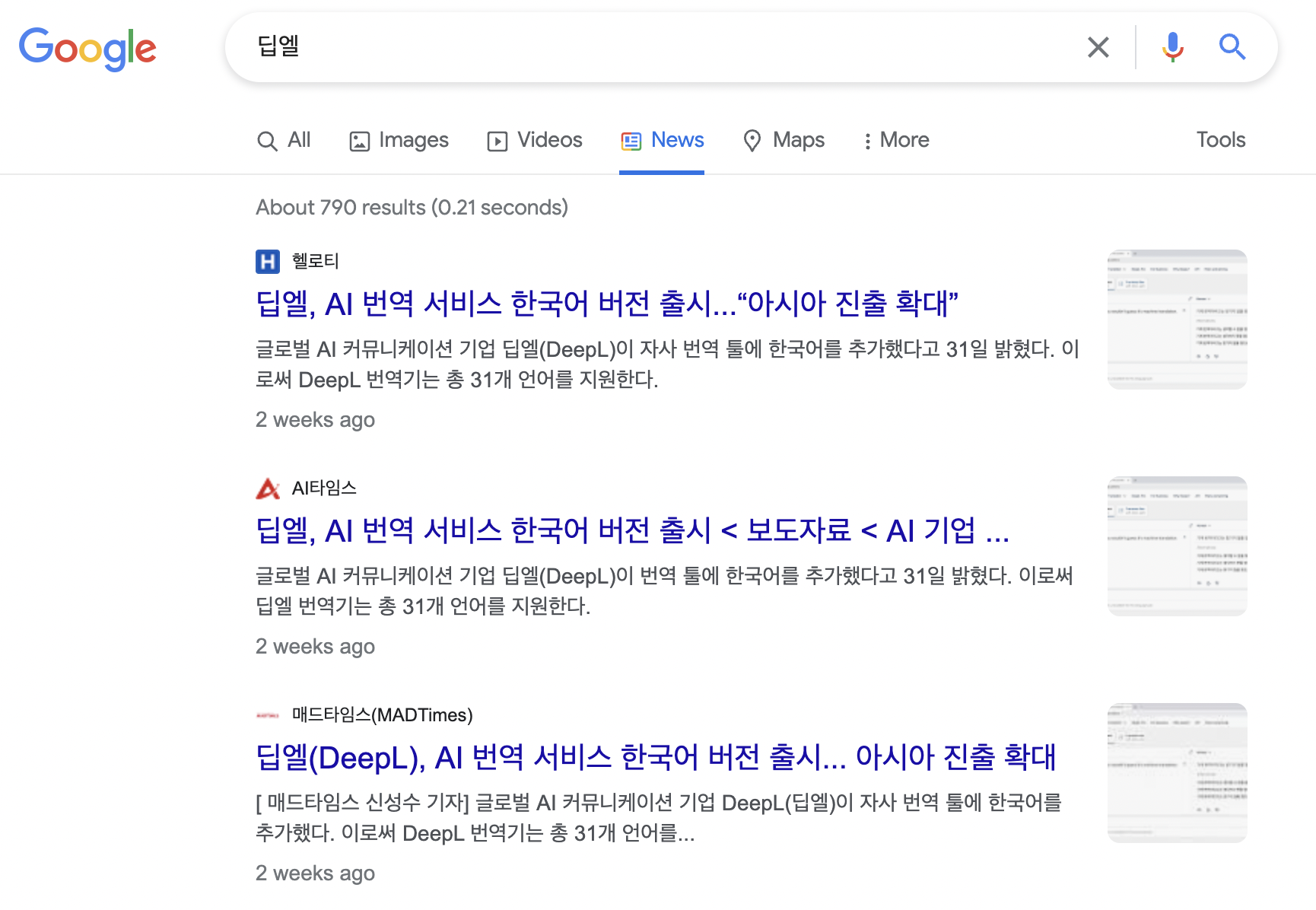 독일의 인공 지능 업체인 디프 엘사의 제품입니다만. 그동안 한국어를 지원하지 않았지만 올해 초 한국어 서비스를 오픈함에 번역 품질로 국내에서도 많은 주목을 끌고 있는 번역입니다. 구글 번역기 Vs. 네이버 아빠고 Vs. DeepL(디프 엘)번역기 국내에서 가장 많이 쓰는 번역기인 구글, 파파고, DeepL은 모두 인공 신경망 기반의 딥 러닝 기술을 사용하고 있는데 이 가운데 구글과 파파고는 순환 신경망, DeepL은 합성 호르몬 신경망 기술을 기반으로 하고 있습니다. 현재 관련 미디어나 주변 지인의 얘기를 듣고 보면 DeepL이 영어 논문과 영문 기사, 영문 매뉴얼 등의 번역에서 상당한 품질을 나타내고 있다고 합니다. 사실 이 분야에서는 구글 번역보다 완성도가 높다고 소문이 돌고 있었습니다. 최근 전자 신문에서 보도했다 DeepL관련 기사의 내용 가운데 구글 번역기와 파파고과 함께 번역 품질을 비교한 부분의 일부를 인용하고 보겠습니다. 전자 신문 기사 본문 내용의 로이터 통신의 영문 기사의 일부를 비교했는데요. 이 기사 원문은 다음과 같습니다. Until recently, Brett Schickler never imagined he could be a published author, though he had dreamed about it. But after learning about the ChatGPT artificial intelligence program, Schickler figured an opportunity had landed in his lap. 이것을 내가 복사해서 구글 번역기부터 한국어로 번역했습니다.
